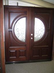 Pair of solid Mahogany exterior doors. The total jamb to jamb dimensions are 74” x 97” x 6-5/8”. This entryway includes two solid Mahogany exterior doors 1-3/4” thick with a five panel and one lite design having a shelf, custom carvings, and a custom hinged iron grill all with raised mouldings. The thermopaned windows have clear tempered glass. The pair of doors is prehung on solid Mahogany exterior jambs 6-5/8” wide with kerf having Q-Lon weather stripping, oil-rubbed bronze hinges, an exterior astragal with kerf and flush bolts installed, an adjustable bronze sill, and all brick mould. All wood pieces for this entry way are unfinished. A Sikkens stain and finish is available for an additional charge with any color of your choice. The door system has a right hand active inswing.