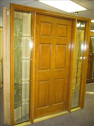 Solid Oak exterior door with two direct set sidelites. The total jamb to jamb dimensions are 68” x 81-7/8” x 4-5/8”. This entryway includes one solid Oak exterior door 1-3/4” thick with a six panel design having cope and stick mouldings. The direct set thermopaned windows in the sidelites have a ten lite design with clear beveled and brass caming. The door and two sidelites are prehung on solid Oak exterior jambs 4-5/8” wide with kerf having Q-Lon weather stripping, brass hinges, an adjustable brass sill, and all brick mould. All wood pieces for this entry way have a factory stain and finish. The door system has available a right hand inswing.